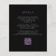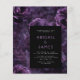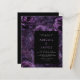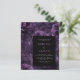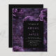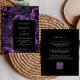 This elegant, moody wedding invitation features a lush, romantic watercolor pattern of deep purple roses. Customize the pale purple and silver gray text in stylish fonts on a black rectangle. The reverse side provides space for wedding details on a solid black background, along with a QR code guests can scan to visit your website and RSVP.