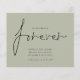 Budget Decided On Forever Pale Sage Engagement Announcement. A budget price SMALLER 4.5” x 5.6” alternative. Available in a SEMI-GLOSS 110 lb CARD STOCK which is the default option (thicker for invitations), OR a SATIN FINISH 80 lb THINNER PAPER STOCK (ideal for enclosures). A simple design on a background of sage green to let everypone know the happy news of your engagment. We Decided on Forever which is in a stylish set script is in the center.The rest of the text you can easily personalise. Text and background colors can be changed if you wish to better suit your wedding theme via the customise further option.