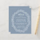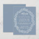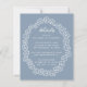 A budget wedding details card with the text enclosed in a roughly oval floral frame, a flower wreath. The title details is written in script, the rest in caps. The text and the floral frame are white, the background dusty blue.
