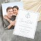 This budget minimalist nautical wedding save the date card features an anchor monogram at the top with the initials of the bride and groom, with a simple white background and dusty blue text, and a photo template on the back.