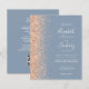 The left-hand edge of this elegant modern wedding invitation features a peach faux glitter border. The customizable text combines white handwriting, copperplate and italic fonts on a dusty blue background. The reverse side provides space for wedding details on a solid dusty blue background, along with a QR code guests can scan to visit your website and RSVP, which saves the cost of printing and mailing separate RSVP cards.