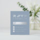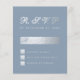 An elegant budget RSVP for a wedding. with dusty blue and silver wedding colors. The background is dusty blue. The title RSVP is faux silver foil, the rest of the text is silvery gray, except the letter M, that is dusty blue. The title RSVP and the letter M are written in an elegant calligraphic script, the rest in caps. The rectangular box for the name, the small square boxes and the back are faux silver foil.