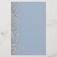 The left-hand edge of this elegant modern wedding menu features a silver faux glitter border. The customizable text combines white handwriting script and copperplate fonts on a dusty blue background. The reverse side features a matching dusty blue and silver glitter design.