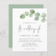 A value for money BUDGET alternative on a smaller size 4.5 x 5.6” semi-gloss 110lbs weight, which is of similar thickness to a postcard (however is not suitable to use as a postcard.). PLEASE NOTE there is ONE invite per sheet. Budget Elegant Eucalyptus Wedding Invitation. An informal set typography in black for the main heading the Wedding Of complementing the rest of the text which you can easily personalise. A branch of modern green eucalyptus leaves runs above and on the back is a coordinating shade of green.