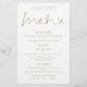 Budget Elegant Script Black White Wedding Menu. A budget price size 5.5” x 8.5”,. An elegant typographical design in gold and white, with a stylish set script for the header Menu. Easily personalise the rest of the text to your own details which includes alternatives for your vegan or vegetarian options. You can also change text styles and colors as well as the background colors via the customise further option if you wish.