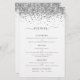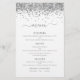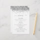 Budget Elegant Silver Glitter Script Wedding Menu. A budget price size 5.5” x 8.5”, on an elegant 110 lb LINEN stock – for a luxury feel at great value, this is perfect for menus, as well as invitations and programs etc. This budget size alternative is also available in other paper choices. The SEMI-GLOSS 110 lb card stock is about the same thickness as a postcard, so also works well for invitations. The FELT 100 lbs paper is buff colored, NOT white, so adds a rustic touch. The MATTE 80lbs paper stock is bright white, for crisp printing, great for your menus and programs, whilst the SATIN 80lbs paper is thin and light, ideal for enclosures. An elegant script with swashes for the header Menu and a faux glitter border at the top on both sides in gold. Easily personalise the rest of the text to your own details which includes alternatives for your vegan or vegetarian options.