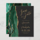 The left-hand edge of this elegant modern wedding save the date card features an emerald green watercolor agate border trimmed with faux gold glitter. The customizable text combines gold-colored script and sans serif fonts on a slate black background. The reverse side features a matching green and gold agate design.