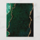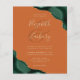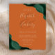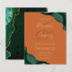 An emerald green watercolor agate design trimmed with faux gold glitter appears in two corners of this elegant design. Personalize it with the couple's names in gold-colored handwriting script over a large rust ampersand. Add the wedding details in gold-colored copperplate and italic fonts on a burnt orange background. The reverse side features a matching green and gold agate design.