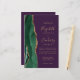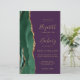 The left-hand edge of this elegant modern wedding invitation features an emerald green watercolor agate border trimmed with faux gold glitter. The customizable text combines gold-colored handwriting, copperplate and italic fonts on a purple background. Add additional details on the back, along with a QR code to help your guests visit your wedding website.
