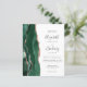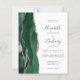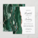The left-hand edge of this elegant modern wedding invitation features an emerald green watercolor agate border trimmed with faux rose gold glitter. The customizable text combines charcoal gray handwriting, copperplate and italic fonts on a white background. The reverse side features a matching emerald green and rose gold agate design. NOTE: Envelopes are not automatically included with these budget invitations, so please remember to choose the "blank white envelopes" option!