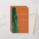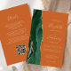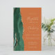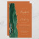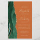 The left-hand edge of this elegant modern wedding invitation features an emerald green watercolor agate border trimmed with faux gold glitter. The customizable text combines gold-colored handwriting, copperplate and italic fonts on a burnt orange or rust background. Add additional details on the back, along with a QR code to help your guests visit your wedding website.