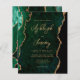 This elegant wedding invitation features a background image of emerald green watercolor agate trimmed with faux gold glitter. The customizable text combines gold-colored modern handwriting, copperplate and italic fonts. The reverse side features a coordinating emerald green and gold agate design.
