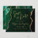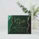 This elegant wedding save the date card features a background image of emerald green watercolor agate trimmed with faux gold glitter. The customizable text combines gold-colored modern handwriting, copperplate and italic fonts. The reverse side features a coordinating emerald green and gold agate design.