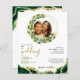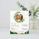 Create elegant emerald green budget wedding invitations for your jewel tone theme wedding that feature eucalyptus wreath and agate style pattern decorated with faux gold glitter. Please upload your photo using the template to have your image in a round shape. The square photo is the best, but you can also try others to see if they suit here. Personalize the invites with your names, date, place and initials on the front and back sides. You can customize even more inside the design tool.
