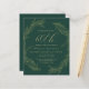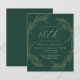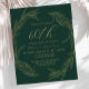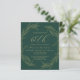 This sophisticated 60th (or edit to any year) birthday party invitation features a gold line art drawing of a foliage wreath on an emerald green background. The number "60th" and the name of the guest of honor appear in elegant gold-colored handwriting script, with the rest of the customizable text in sans serif font. The back of the card is solid green.
