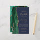 The left-hand edge of this elegant modern wedding invitation features an emerald green watercolor agate border trimmed with faux gold glitter. The customizable text combines gold-colored handwriting, copperplate and italic fonts on a navy blue background. The reverse side features a matching emerald green and gold agate design.