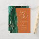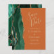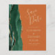 The left-hand edge of this elegant modern wedding save the date card features an emerald green watercolor agate border trimmed with faux gold glitter. The customizable text combines gold-colored handwriting, copperplate and italic fonts on a burnt orange or rust background. The reverse side features a matching emerald green and gold agate design.