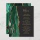 The left-hand edge of this elegant modern wedding menu features an emerald green watercolor agate border trimmed with faux gold glitter. The customizable text combines gold-colored whimsical handwriting script and copperplate fonts on a slate black background. The reverse side features a matching emerald green and gold agate design.