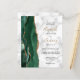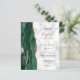 The left-hand edge of this elegant modern wedding invitation features an emerald green watercolor agate border trimmed with faux gold glitter. The customizable text combines gold-colored handwriting script with black copperplate and italic fonts on a gray and white marble background. The reverse side provides spaces for 4 photos (1 square, 2 horizontal, 1 long vertical) and room for your wedding website URL or other information.