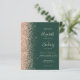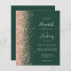 The left-hand edge of this elegant modern wedding invitation features a peach faux glitter border. The customizable text combines peach handwriting, copperplate and italic fonts on an emerald green background. The reverse side provides space for wedding details on a solid green background, along with a QR code guests can scan to visit your website and RSVP, which saves the cost of printing and mailing separate RSVP cards.
