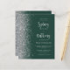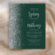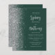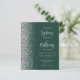 The left-hand edge of this elegant modern wedding invitation features a silver faux glitter border. The customizable text combines pale silver gray calligraphy script and sans serif font on an emerald green background. The reverse side features a matching emerald green and silver design.