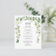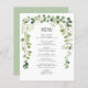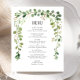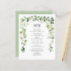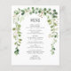 This stylish rustic wedding menu features a delicate watercolor eucalyptus greenery arch. The title and text appears in two coordinating charcoal gray sans serif fonts. The reverse is solid pale green.