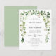 This stylish rustic wedding invitation features a delicate watercolor eucalyptus greenery arch. Personalize it with the couple's names and wedding details in charcoal gray sans serif font. The back of the card is a solid shade of green matching the watercolor design.
