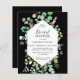 This Botanical Leafy Bridal Shower Invitations - features black handwritten and elegant script text with greenery Eucalyptus frame on the black background. The reverse side of the bridal invitation is laconic black.
