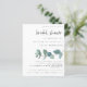 Eucalyptus Bridal Shower Tea Invitation. A budget price SMALLER 4.5” x 5.6” alternative. Available in a SEMI-GLOSS 110 lb CARD STOCK which is the default option (thicker for invitations), OR a SATIN FINISH 80 lb THINNER PAPER STOCK (ideal for enclosures). Envelopes are an optional extra and are slightly larger than the card size. Modern minimalist style with a single branch of teal blue eucalyptus leaves across the page from the left hand side. Bridal Shower is set in a modern handwriting style and is placed above the leaves along with your names, with the other details beneath. Easily personalise the details to your own. A coordinating turquoise blue background is on the reverse. You can change text and background colors to any of your choice to match your wedding color theme.