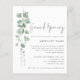 Budget Eucalyptus Company Store Opening Invitation. A budget price SMALLER 4.5” x 5.6” alternative. Available in a SEMI GLOSS 110 lb CARD STOCK which is the default option (similar to the thickness of a postcard, recommended for invitations), OR a SATIN FINISH 80 lb THINNER PAPER STOCK (ideal for enclosures). Minimalist botanical style, with watercolor greenery flowing down on the left hand side and text to the right. A set informal script for Grand Opening and the rest of the text you can easily personalise.
