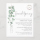 Budget Eucalyptus Logo QR Code Company Store Opening Invitation. A budget price SMALLER 4.5” x 5.6” alternative. Available in a SEMI GLOSS 110 lb CARD STOCK which is the default option (similar to the thickness of a postcard, recommended for invitations), OR a SATIN FINISH 80 lb THINNER PAPER STOCK (ideal for enclosures). Minimalist botanical style, with watercolor greenery flowing down on the left hand side and text to the right. A set informal script for Grand Opening and the rest of the text you can easily personalise. Replace the sample image on the front with your business logo and on the back replace the sample QR code with your own to the event page information on your company website.