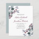 Budget Dusty Green Eucalyptus Burgundy Red Holly Berries Winter Wedding Invitation... The front of our affordable holiday themed wedding invitation features bouquets of dusty green eucalyptus branches and burgundy holly berries bordering your invitation text. The back of the invitation displays a shade of dusty green that you see within the eucalyptus leaves themselves. All example text can be easily revised with your own information on the personalization template.
