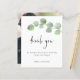 Elegant Eucalyptus Leaf Script Photo Thank You. A budget price SMALLER 4.5” x 5.6” alternative. Available in a SEMI-GLOSS 110 lb CARD STOCK which is the default option (thicker for invitations), OR a SATIN FINISH 80 lb THINNER PAPER STOCK (ideal for enclosures). Envelopes are an optional extra and are slightly larger than the card size. An elegant branch of green eucalyptus leaves flows partially across from the right hand side, with set typography Thank You in a modern handwritten style. On the back, swap in your favorite photo from your day (of portrait orientation). The rest of the text on the front you can easily personalise to your own words.