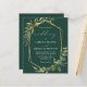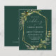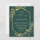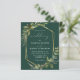 This elegant rustic wedding invitation features a gold faux foil geometric frame decorated with eucalyptus and olive greenery on an emerald green background. The word "wedding" appears in calligraphic script. Customize the white text with the names of the bride and groom and the wedding details on the front, and their initials and website URL on the solid emerald green reverse.