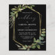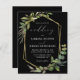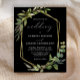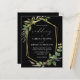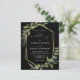 This elegant rustic wedding invitation features a gold faux foil geometric frame decorated with eucalyptus and olive greenery on a black background. The word "wedding" appears in calligraphic script. Customize the white text with the names of the bride and groom and the wedding details on the front, and their initials and website URL on the reverse.
