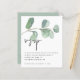 Eucalyptus Elegant Script QR Code Wedding RSVP enclosure. A budget price SMALLER 4.5” x 5.6” alternative. Available in a SEMI-GLOSS 110 lb CARD STOCK which is the default option (thicker for invitations), OR a SATIN FINISH 80 lb THINNER PAPER STOCK (ideal for enclosures). Add your QR code to your wedding website on the back makes this a convenient option for your guests to RSVP. You can create QR codes for free online. Simply search “QR code creator” and lots of options come up to create for free.. Artsy green watercolor eucalyptus flow across the top and an elegant informal set style for the header with all the details stylishly small beneath.