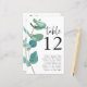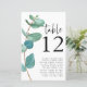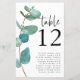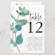 Budget Eucalyptus Wedding Guest names Table No. A budget price 5.5” x 8.5" FLAT card on a shiny SEMI GLOSS 110 lb card stock (similar to the thickness of a postcard). Table is in a set handwriting style script and your table number beneath, and teal blue eucalyptus leaves running along the left hand side. Easily personalise the number and your guest names. The same design is also on the back and number and names will change simultaneously on both sides when you update them.