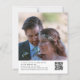 Budget Eucalyptus Wedding Photo QR Code Thank You. A budget price SMALLER 4.5” x 5.6” alternative. Available in a SEMI-GLOSS 110 lb CARD STOCK which is the default option (thicker for invitations), OR a SATIN FINISH 80 lb THINNER PAPER STOCK (ideal for enclosures). Add your QR code to your wedding photo gallery on the back by replacing the QR code on the sample. You can create QR codes for free online. Simply search “QR code creator” and lots of options come up to create for free. The header is set in a modern handwriting style script with the details beneath. A branch of watercolor eucalyptus leaves runs across the top. Easily personalize the text to your own details and replace the sample photo on the back with your own.