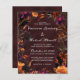 Dark and moody burgundy red provides the lush background for this Fall wedding invitation. Rustic, Boho wildflowers provide the structure in deep green, black and copper orange. Purple and pink flowers lighten in up a bit. Perfect for a late fall or Halloween wedding. The white text has a bit of a vintage vibe about it.