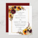 Golden sunflowers, dark red roses and ivory white hydrangea flowers are nestled in autumn leaves and berries. They decorate a gold frame that surrounds your bridal shower details. The back of the bridal shower invitation is deep burgundy red. This item coordinates with the Sunflower and Burgundy Wedding collection. It contains the templates you need to create a wedding invitation suite, wedding signs and reception supplies as well.