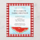 This budget invitation is decorated with watercolor watermelons and a blue sky on a red and white buffalo check background.