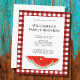 This budget invitation is decorated with watercolor watermelons on a red and white buffalo check background.