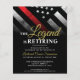 This design features a firemens flag with black and white stripes, and a thin red line stripe as well. "The Legend is Retiring" text sits above all of the party details for the retiring firefighter, lieutenant, or chief.