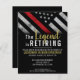 This design features a firemens flag with black and white stripes, and a thin red line stripe as well. "The Legend is Retiring" text sits above all of the party details for the retiring firefighter, lieutenant, or chief.