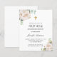 A white background decorated with eucalyptus greenery, white florals (peonies), golden leaves. Personalize and a name and ceremony details.