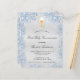 Faux silver metallic looking background decorated with blue faux glitter dust a golden chalice and a host. Personalize and add a name and reception details. Black colored letters.