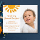Invite family and friends to your first birthday party with this cute 1st Birthday Budget Invitation. It is decorated with a watercolor sun and says "First trip Around The Sun!"