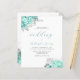 This elegant wedding invitation features aqua floral bouquets trimmed with silver foliage. The word "wedding" and the couple's first names appear in beautiful calligraphy aqua script, with the remaining text in charcoal gray sans serif on a white background. A larger, coordinating aqua and silver floral design appears on the back.