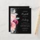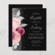 The left-hand edge of this elegant modern wedding invitation features a floral bouquet in shades of burgundy and blush pink, trimmed with silver faux foil and faux glitter foliage and sprinkled with silver faux glitter. The customizable text combines silver gray handwriting script, copperplate and italic fonts on a black background. The reverse side provides space for wedding details on a solid black background, along with a QR code guests can scan to visit your website and RSVP.