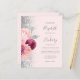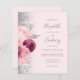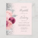 The left-hand edge of this elegant modern wedding invitation features a floral bouquet in shades of burgundy and blush pink, trimmed with silver faux foil and faux glitter foliage and sprinkled with silver faux glitter. The customizable text combines gray handwriting script, copperplate and italic fonts on a blush background. Add additional details on the back, along with a QR code to help your guests visit your wedding website.